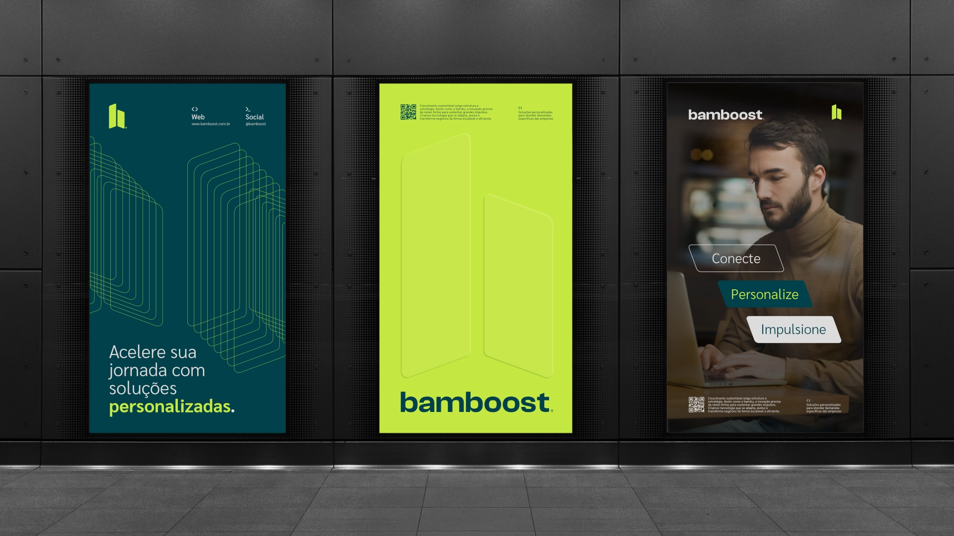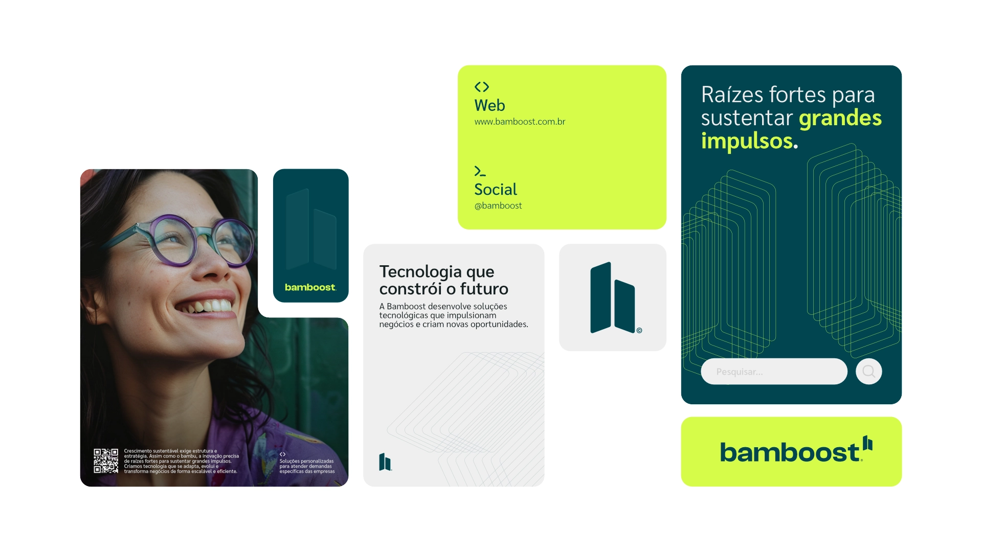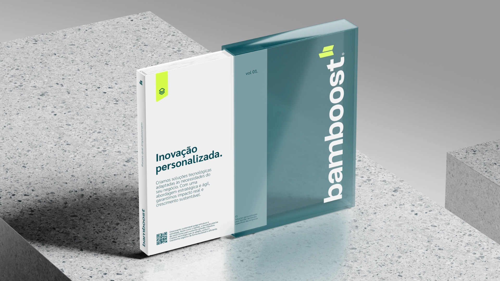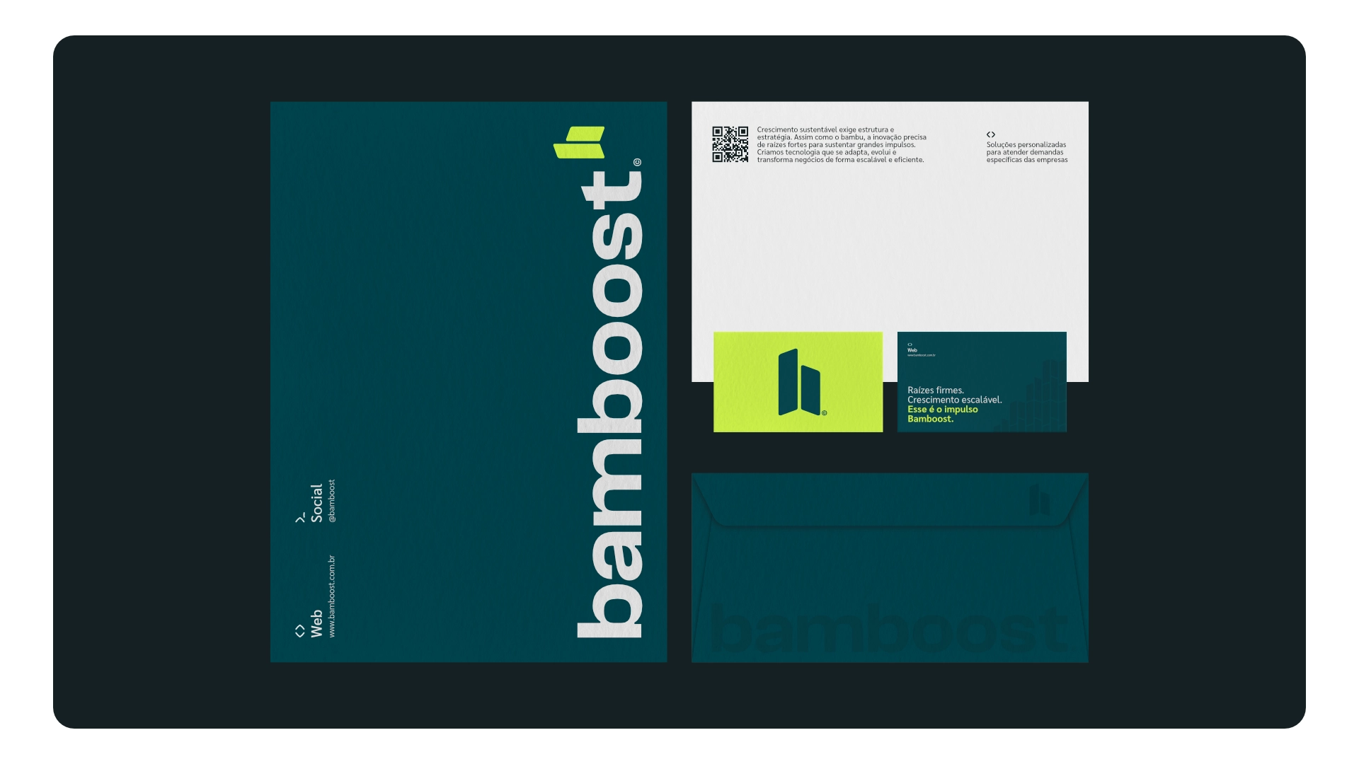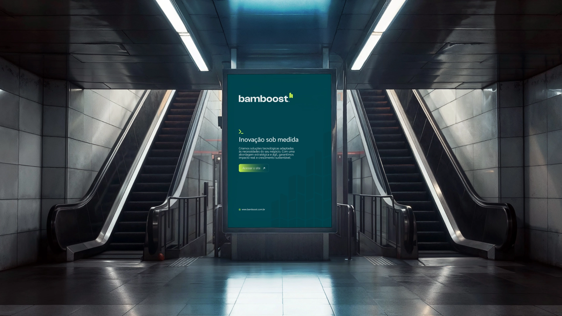 A criação da marca Bamboost foi desenvolvida para traduzir sua essência inovadora e seu posicionamento como força propulsora de crescimento sustentável. A identidade visual nasceu da metáfora do bambu — símbolo de resiliência, estrutura e expansão — combinada à ideia de aceleração tecnológica. O símbolo representa solidez em ascensão, unindo a letra “B” à verticalidade do crescimento e ao dinamismo de um foguete. A paleta une tons sóbrios com verde-lima vibrante, criando contraste entre estabilidade e ousadia. A tipografia, em letras minúsculas e bem espaçadas, transmite modernidade, clareza e acessibilidade. O sistema visual foi projetado para manter consistência e impacto em todos os pontos de contato da marca. O resultado é uma identidade que equilibra estratégia e energia, posicionando a Bamboost como uma marca visionária, confiável e pronta para impulsionar negócios rumo ao futuro.