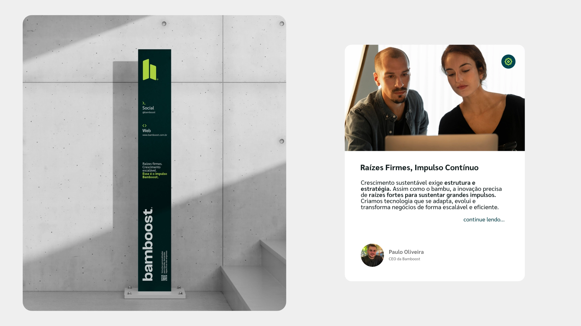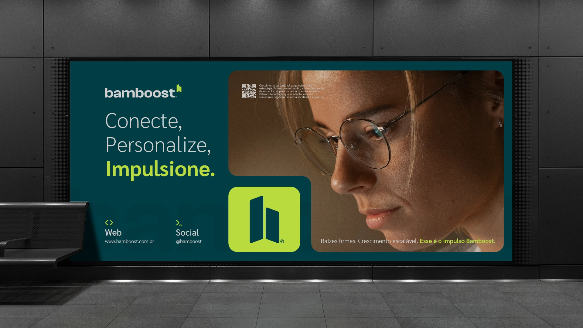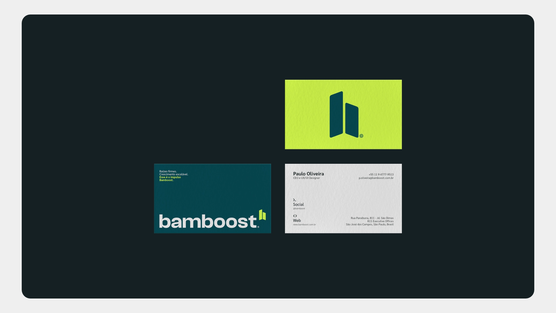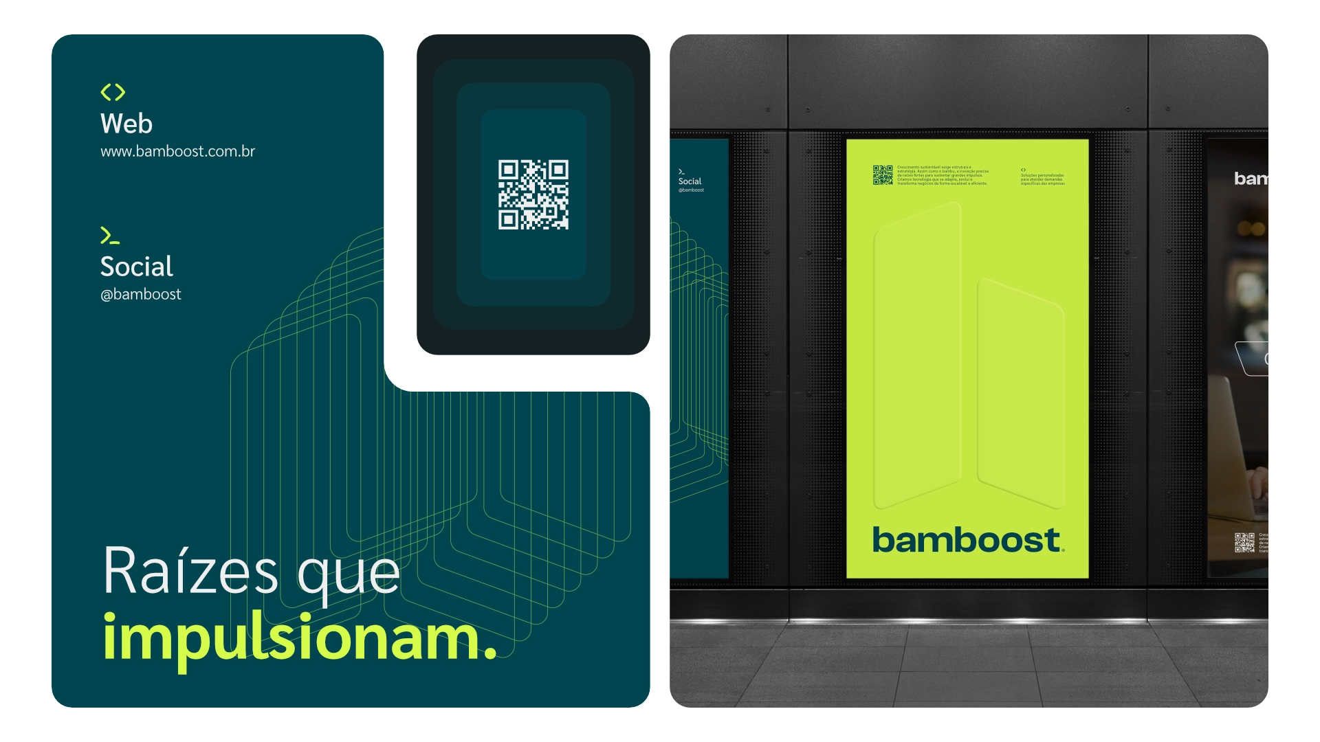 A criação da marca Bamboost foi desenvolvida para traduzir sua essência inovadora e seu posicionamento como força propulsora de crescimento sustentável. A identidade visual nasceu da metáfora do bambu — símbolo de resiliência, estrutura e expansão — combinada à ideia de aceleração tecnológica. O símbolo representa solidez em ascensão, unindo a letra “B” à verticalidade do crescimento e ao dinamismo de um foguete. A paleta une tons sóbrios com verde-lima vibrante, criando contraste entre estabilidade e ousadia. A tipografia, em letras minúsculas e bem espaçadas, transmite modernidade, clareza e acessibilidade. O sistema visual foi projetado para manter consistência e impacto em todos os pontos de contato da marca. O resultado é uma identidade que equilibra estratégia e energia, posicionando a Bamboost como uma marca visionária, confiável e pronta para impulsionar negócios rumo ao futuro.