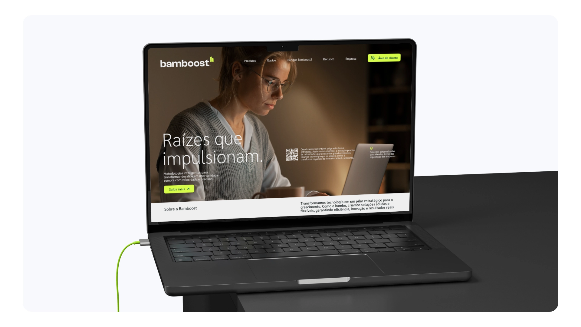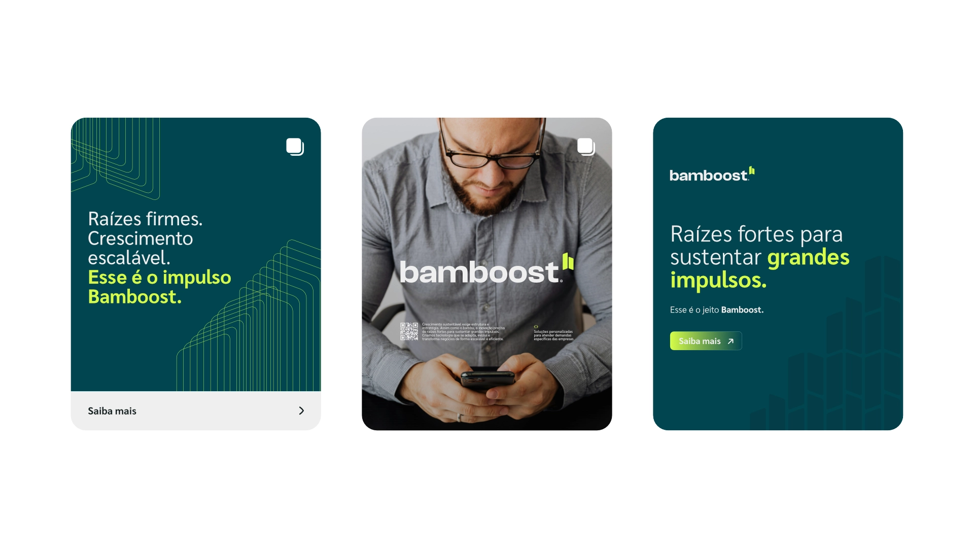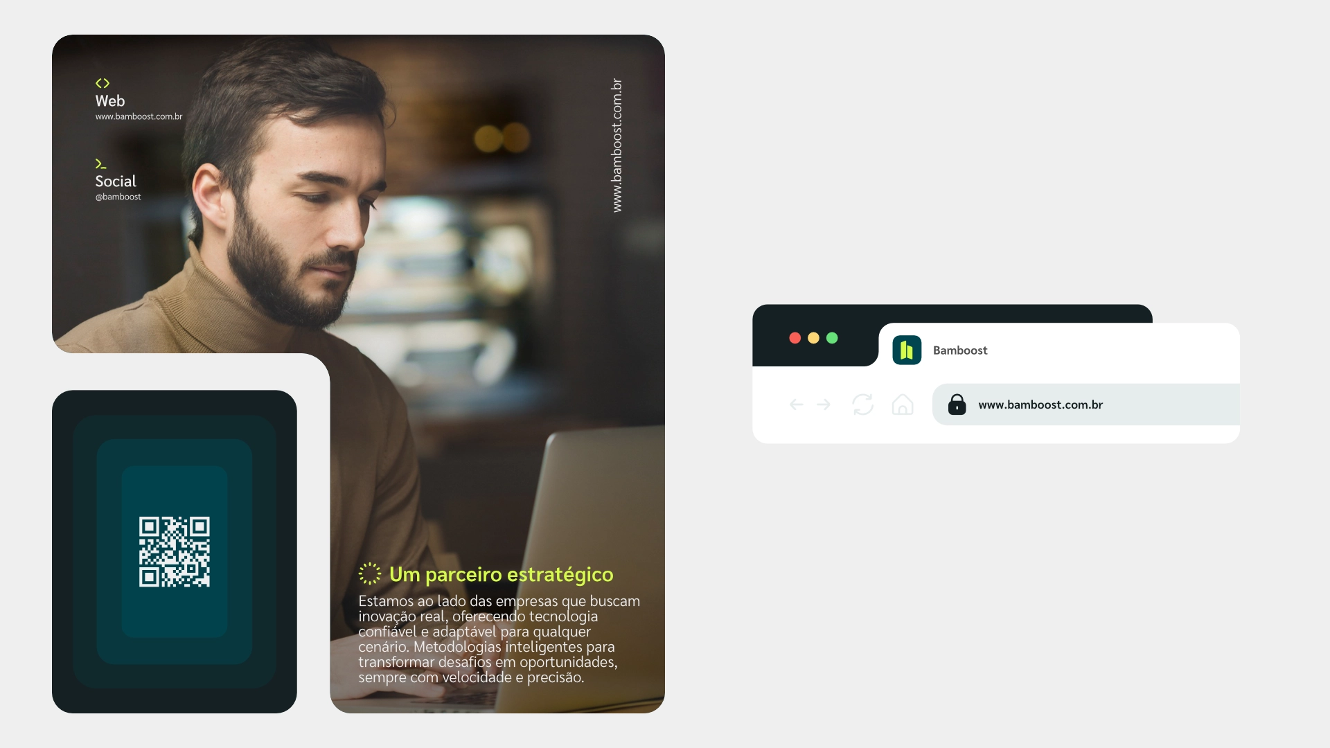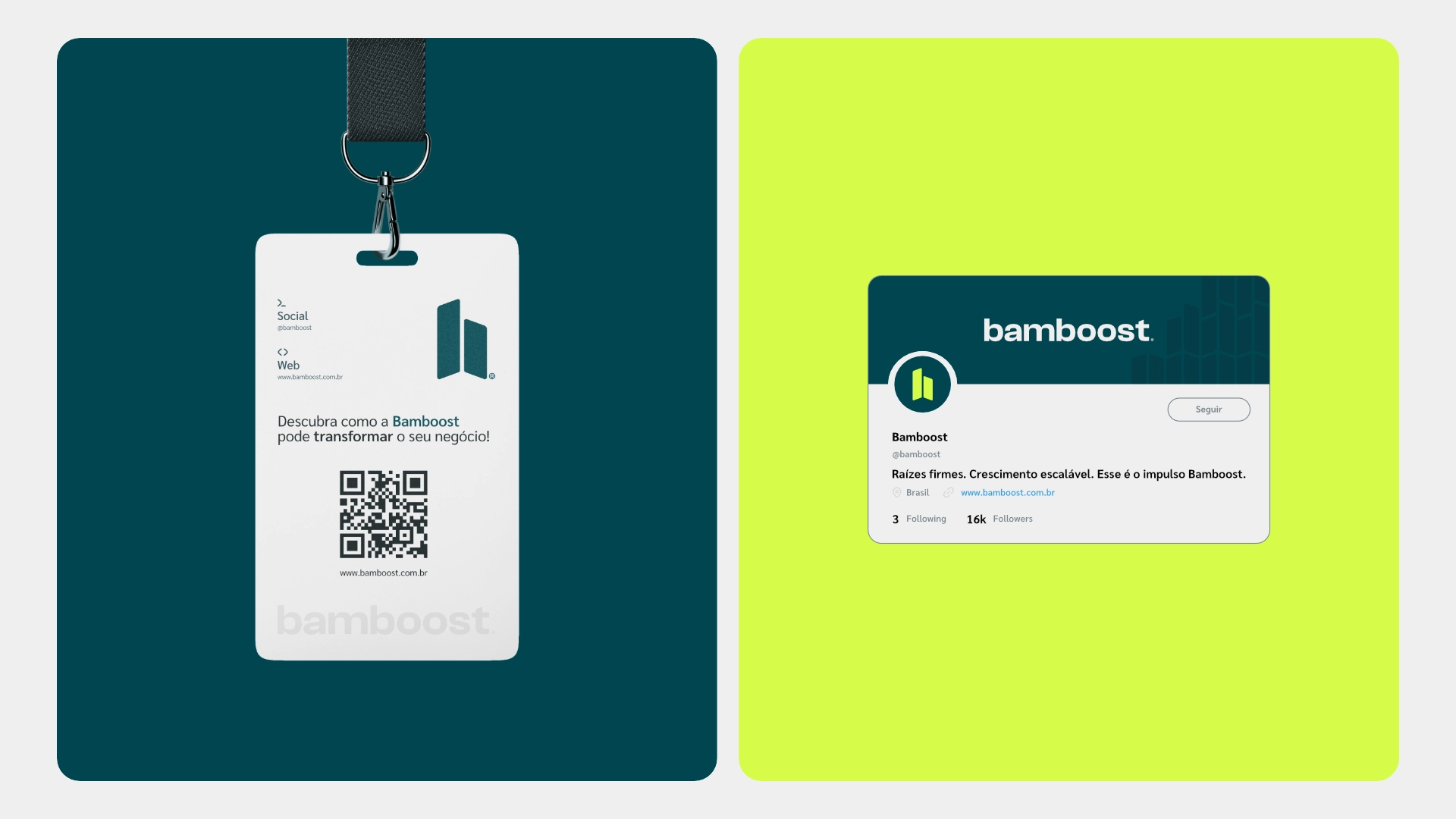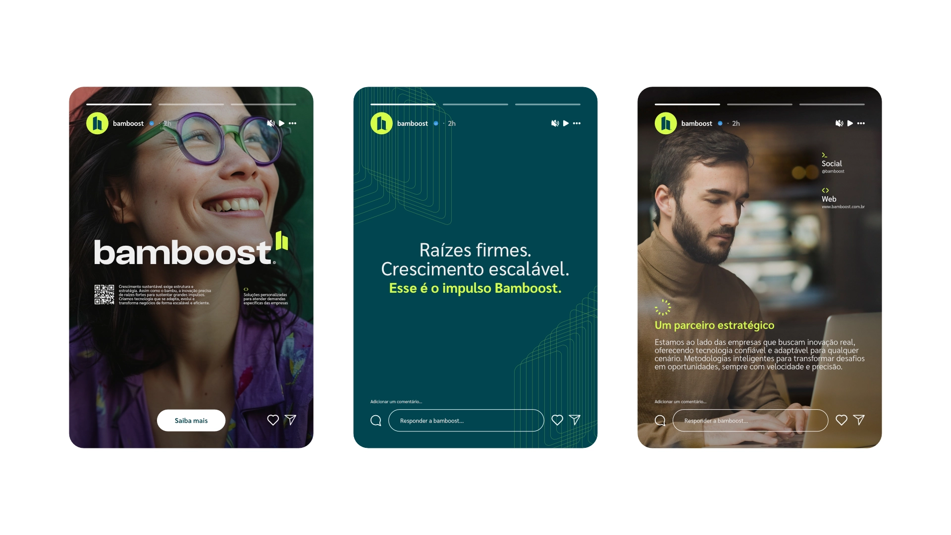 A criação da marca Bamboost foi desenvolvida para traduzir sua essência inovadora e seu posicionamento como força propulsora de crescimento sustentável. A identidade visual nasceu da metáfora do bambu — símbolo de resiliência, estrutura e expansão — combinada à ideia de aceleração tecnológica. O símbolo representa solidez em ascensão, unindo a letra “B” à verticalidade do crescimento e ao dinamismo de um foguete. A paleta une tons sóbrios com verde-lima vibrante, criando contraste entre estabilidade e ousadia. A tipografia, em letras minúsculas e bem espaçadas, transmite modernidade, clareza e acessibilidade. O sistema visual foi projetado para manter consistência e impacto em todos os pontos de contato da marca. O resultado é uma identidade que equilibra estratégia e energia, posicionando a Bamboost como uma marca visionária, confiável e pronta para impulsionar negócios rumo ao futuro.