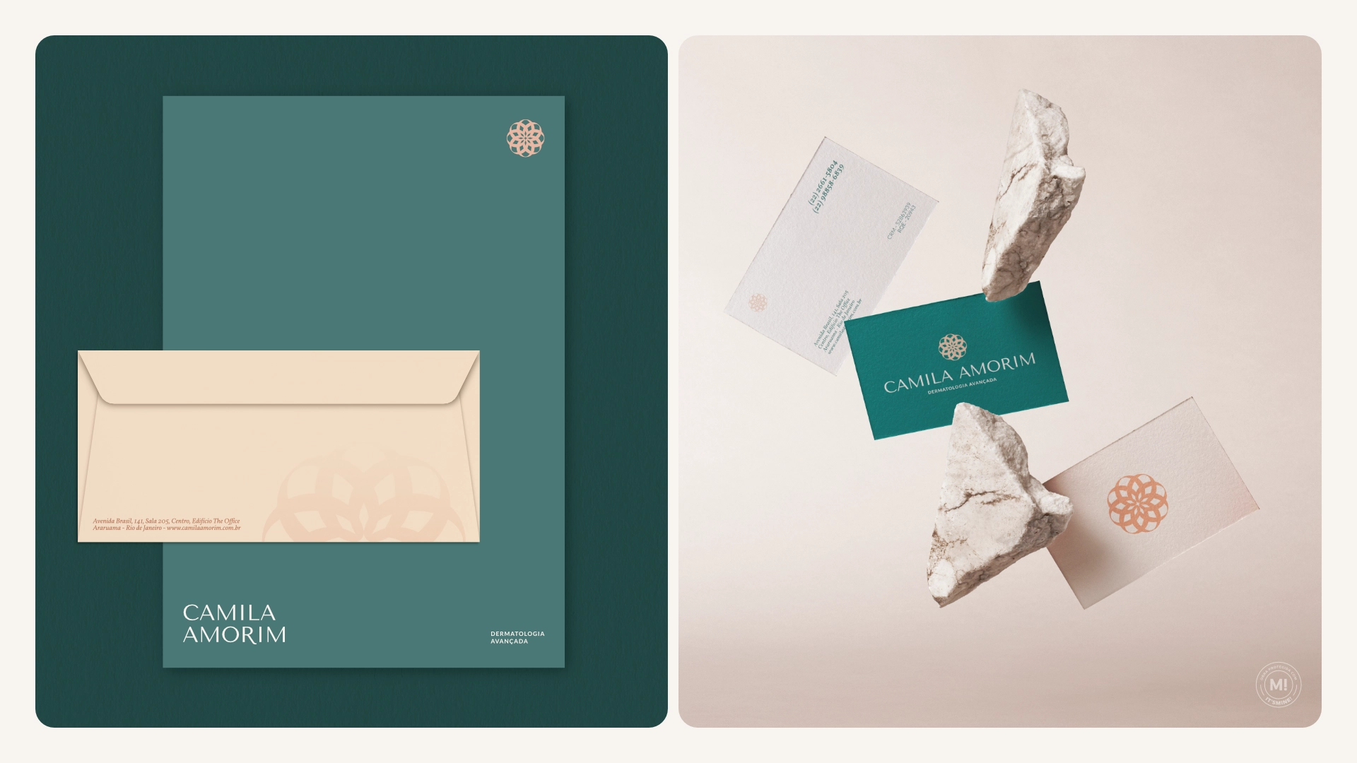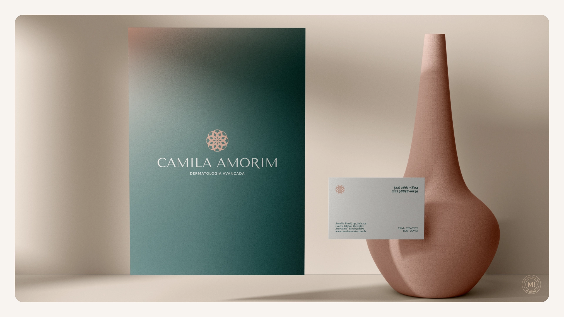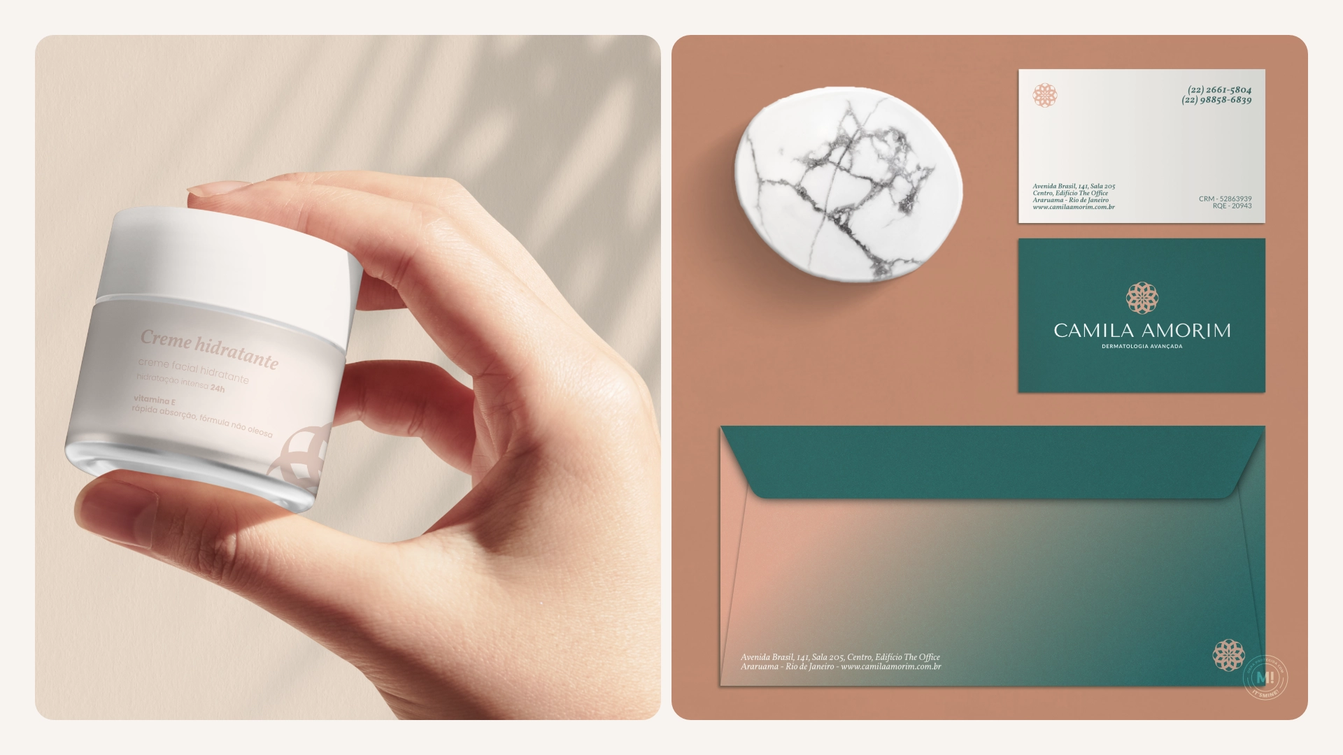A criação da marca da Dra. Camila Amorim foi desenvolvida para refletir seu propósito: oferecer cuidado dermatológico personalizado e humanizado, que promove bem-estar físico e emocional. O projeto traduziu os valores de conexão, amor e autoridade em uma identidade visual sensível e elegante. O logotipo combina contornos suaves e modernos para transmitir acolhimento e profissionalismo, enquanto a tipografia transmite leveza e sofisticação. O símbolo nasce da união de três conceitos: o elo (conexão profunda com cada paciente), o amor (presente no próprio sobrenome) e a coroa (símbolo de força, realeza e conquista pessoal). Essa forma fluida, com espessuras variadas, conecta harmonia e movimento, reforçando o caráter orgânico dos cuidados da Dra. Camila. A paleta combina tons quentes acolhedores e nuances nobres, criando um equilíbrio entre proximidade e autoridade. O resultado é uma marca atemporal, que estabelece laços empáticos, transmite credibilidade e reflete o poder transformador do cuidado dermatológico.