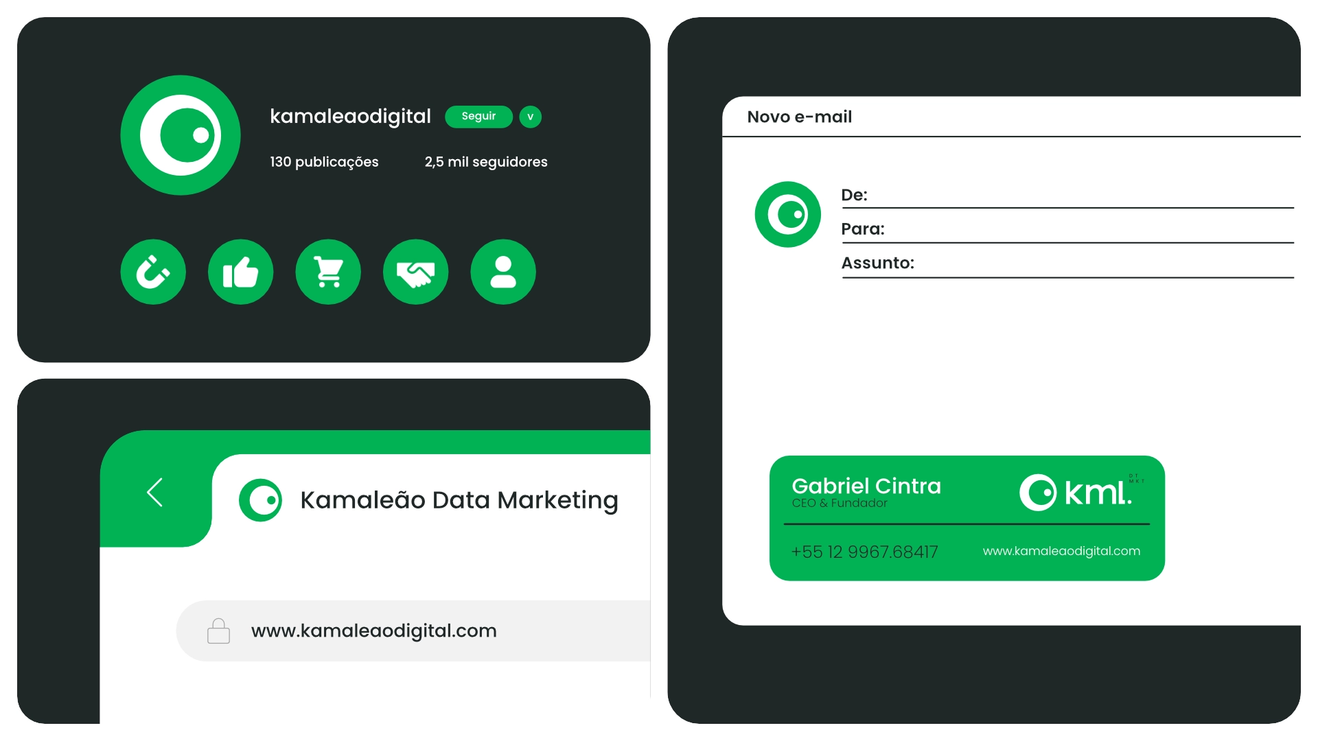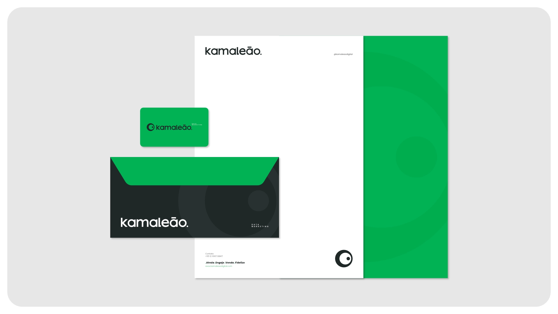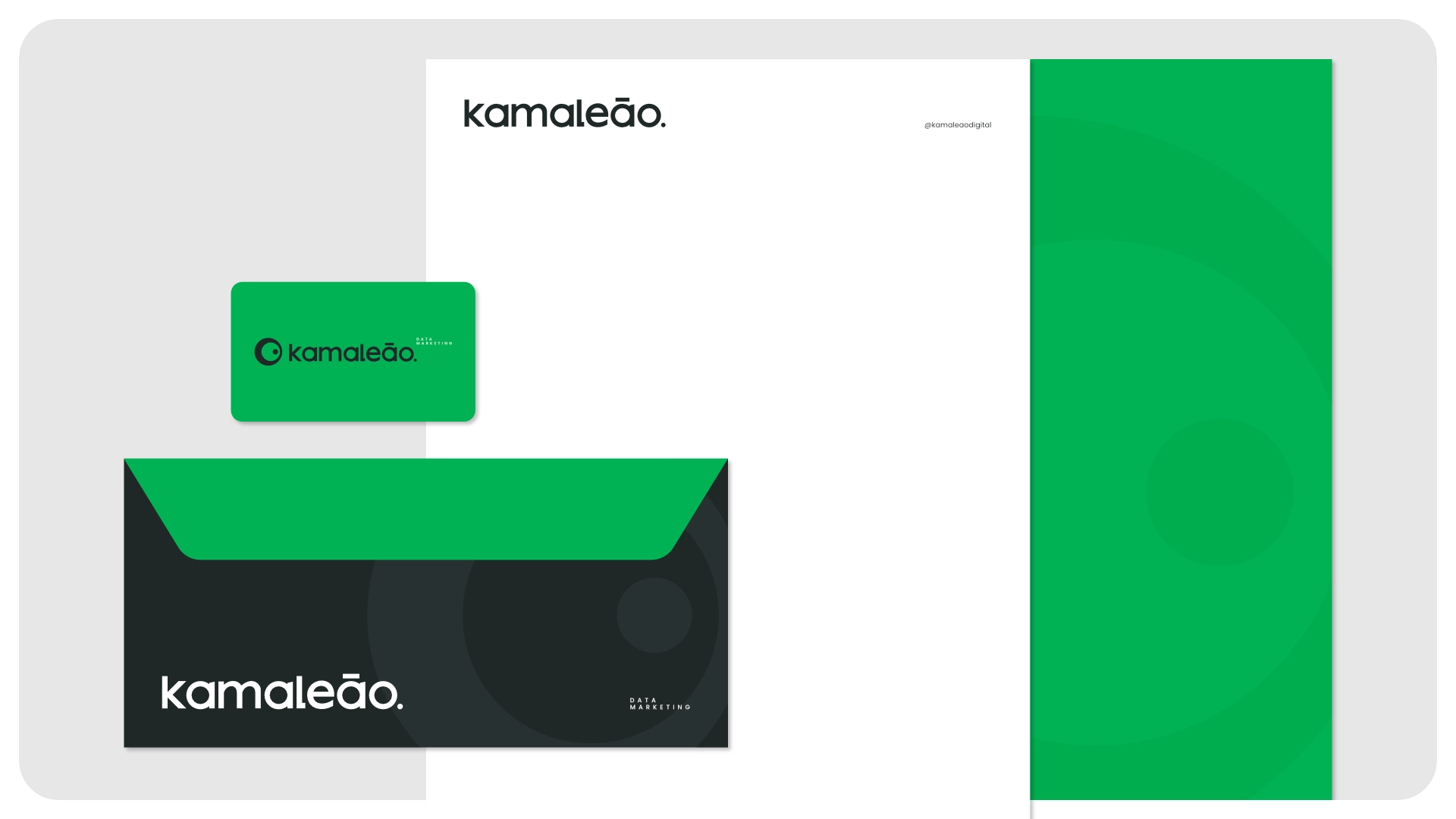 A marca da Kamaleão Data Marketing foi criada para expressar seu posicionamento como agência de performance digital estratégica e adaptável. A identidade visual nasceu da a metáfora do camaleão — representando capacidade de adaptação, visão perspicaz e agilidade diante de cenários dinâmicos. O símbolo, inspirado no olhar do camaleão, reforça vigilância, inteligência de dados e foco em oportunidades sutis do mercado digital. A tipografia moderna e legível transmite profissionalismo e acessibilidade, alinhando-se aos valores de clareza e eficiência. A paleta explora contrastes entre estabilidade e energia, traduzindo confiança com um toque de ousadia. O sistema visual inclui grafismos e elementos moduláveis que se adaptam facilmente a aplicações digitais, relatórios e apresentações. O resultado é uma identidade estratégica e dinâmica, que posiciona a Kamaleão Data Marketing como parceira analítica, flexível e orientada a resultados.